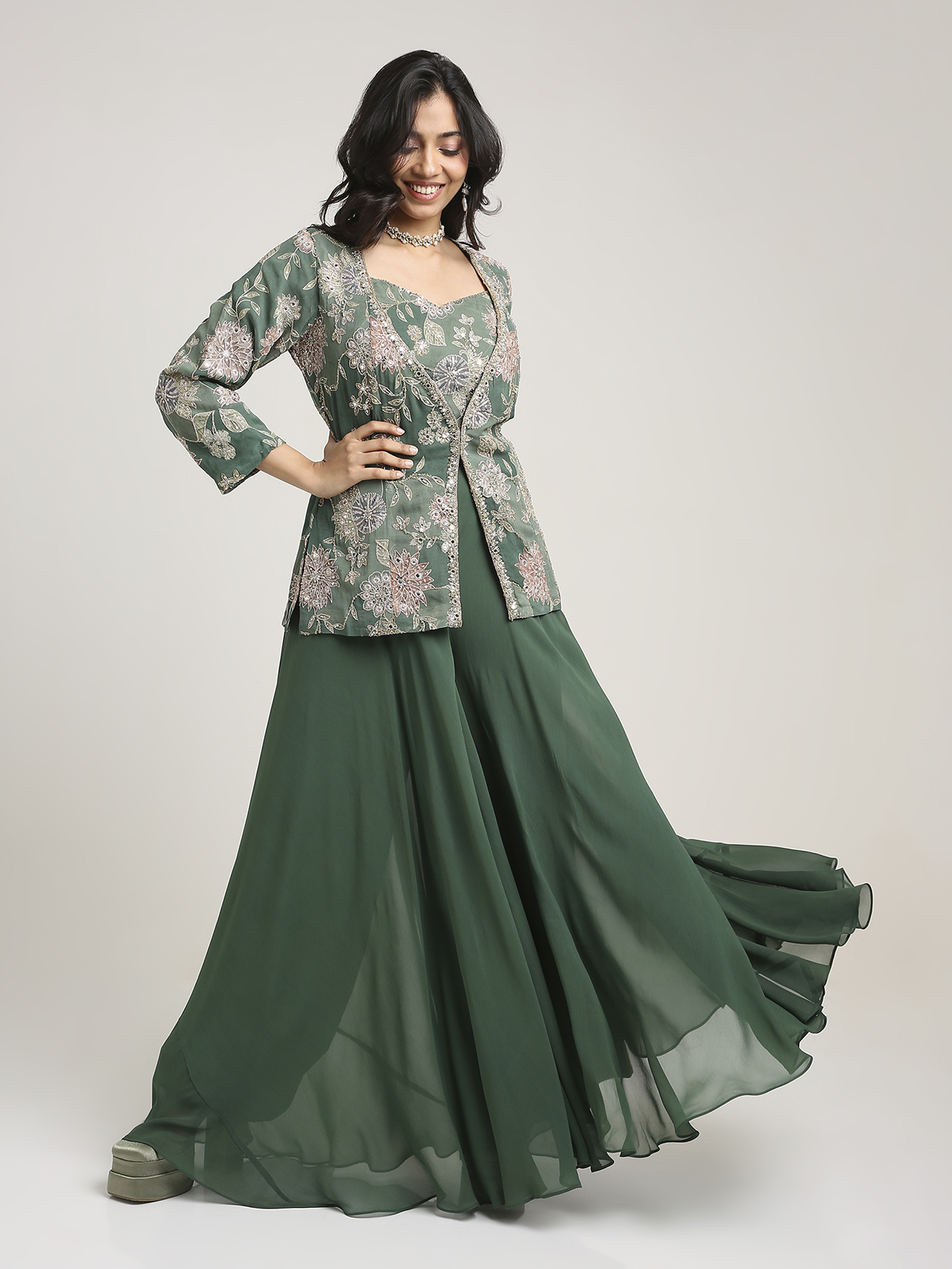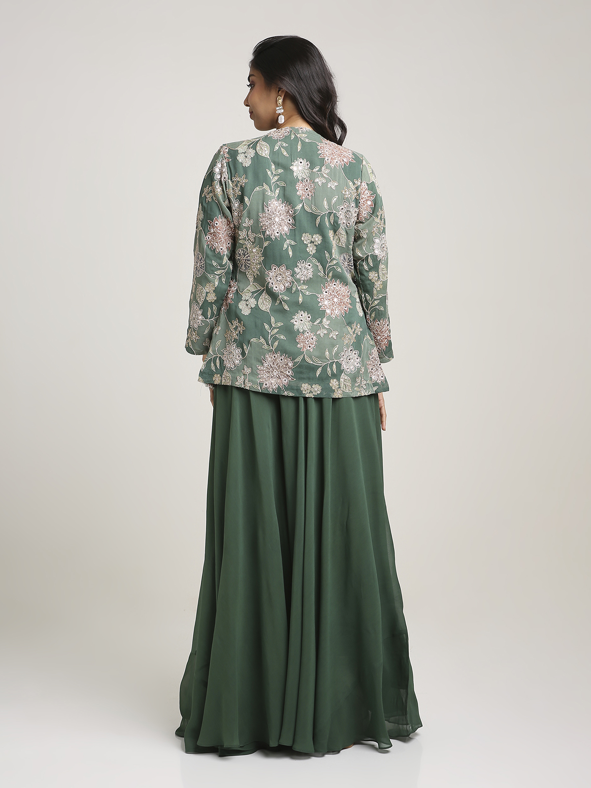 A graceful festive ensemble designed for women who love statement dressing with comfort. This 3-piece garara set features elegant handwork on the blouse and is beautifully complemented by a coordinated jacket that adds depth and sophistication. Ideal for mehendi functions, festive lunches, family celebrations, and intimate wedding occasions, this outfit offers a refined ethnic look that feels stylish, versatile, and effortlessly celebratory. A standout choice for those who appreciate handcrafted charm.