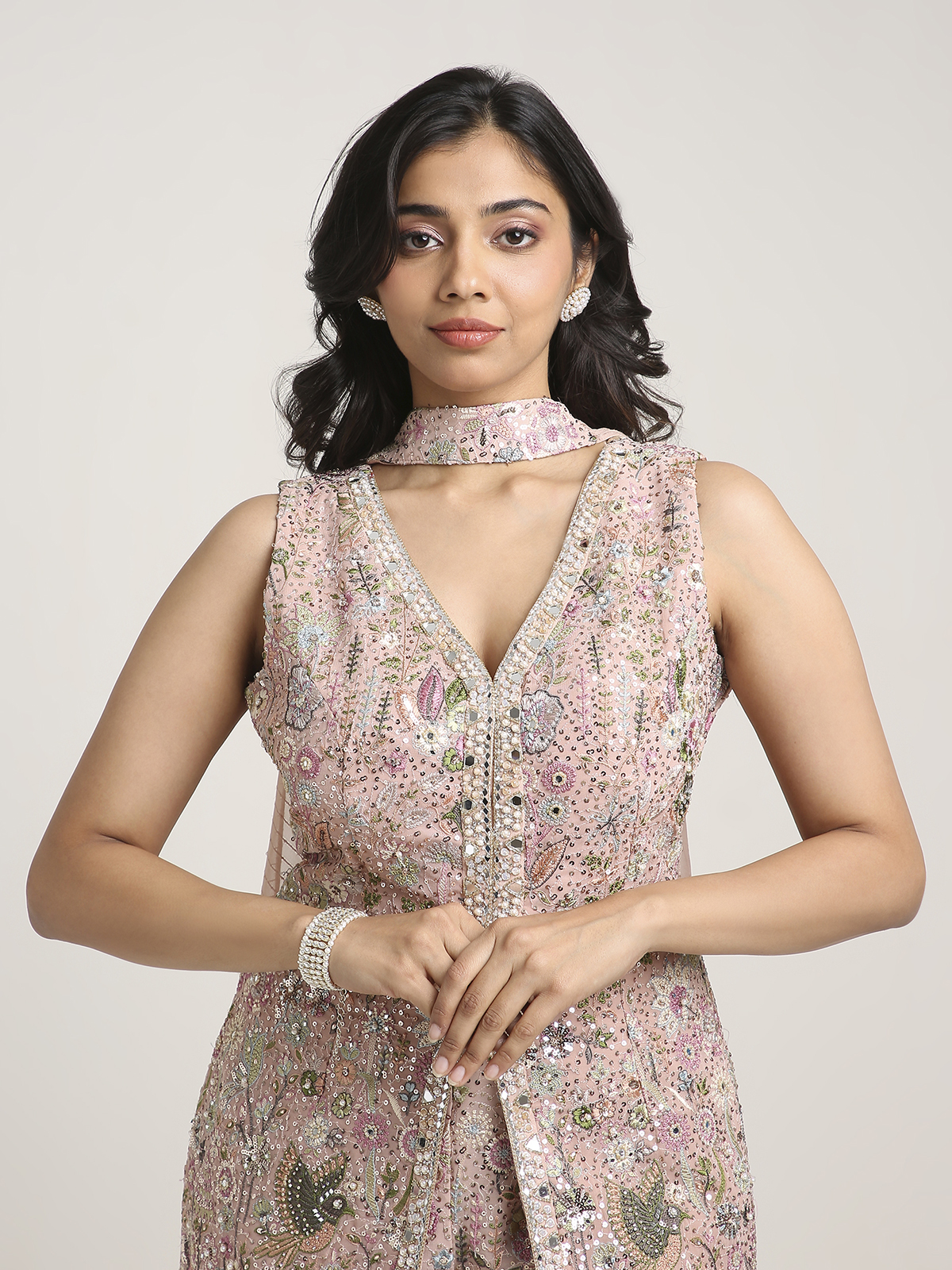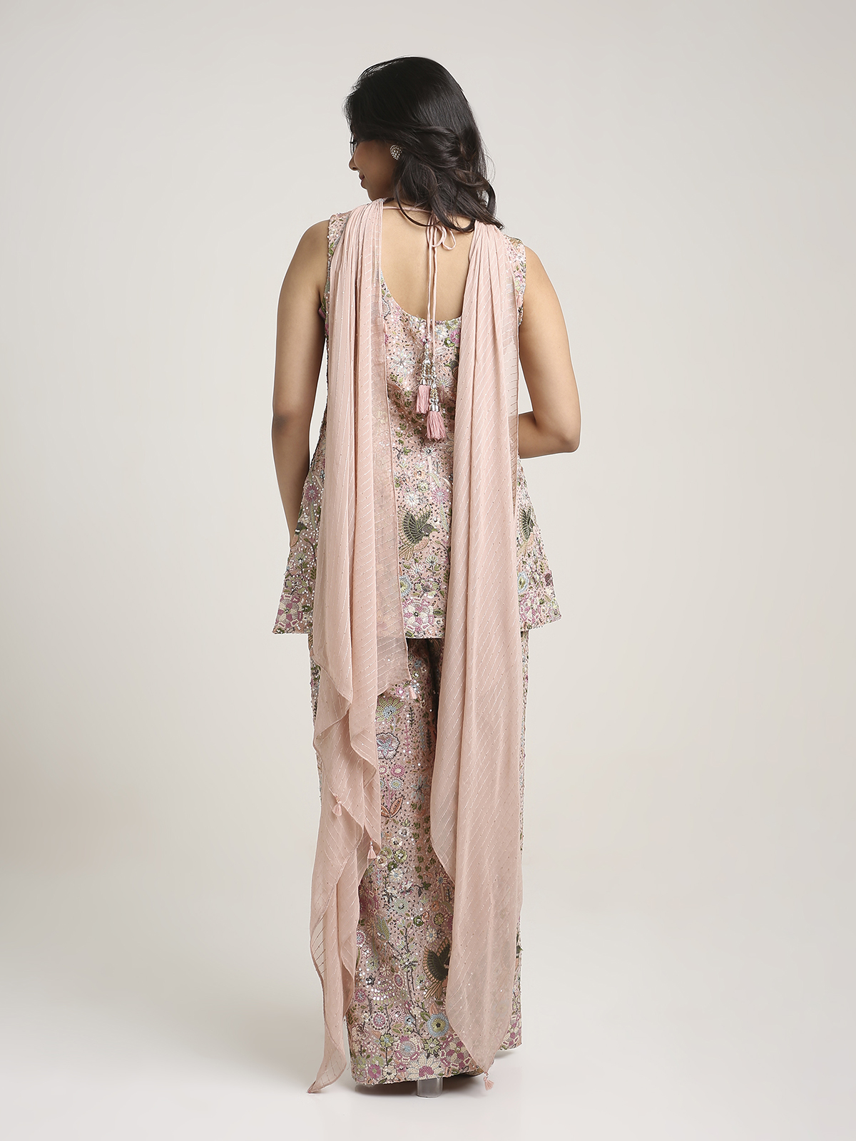 A refined fusion of comfort and festive elegance, this 3-piece palazzo set is designed for the modern woman who values both style and ease. The flowing silhouette creates graceful movement, while the ensemble lends itself beautifully to celebratory occasions. Whether worn at festive dinners, engagement functions, or intimate wedding events, it makes an effortlessly polished impression. This is a premium ethnic outfit that combines contemporary wearability with the richness of traditional design.