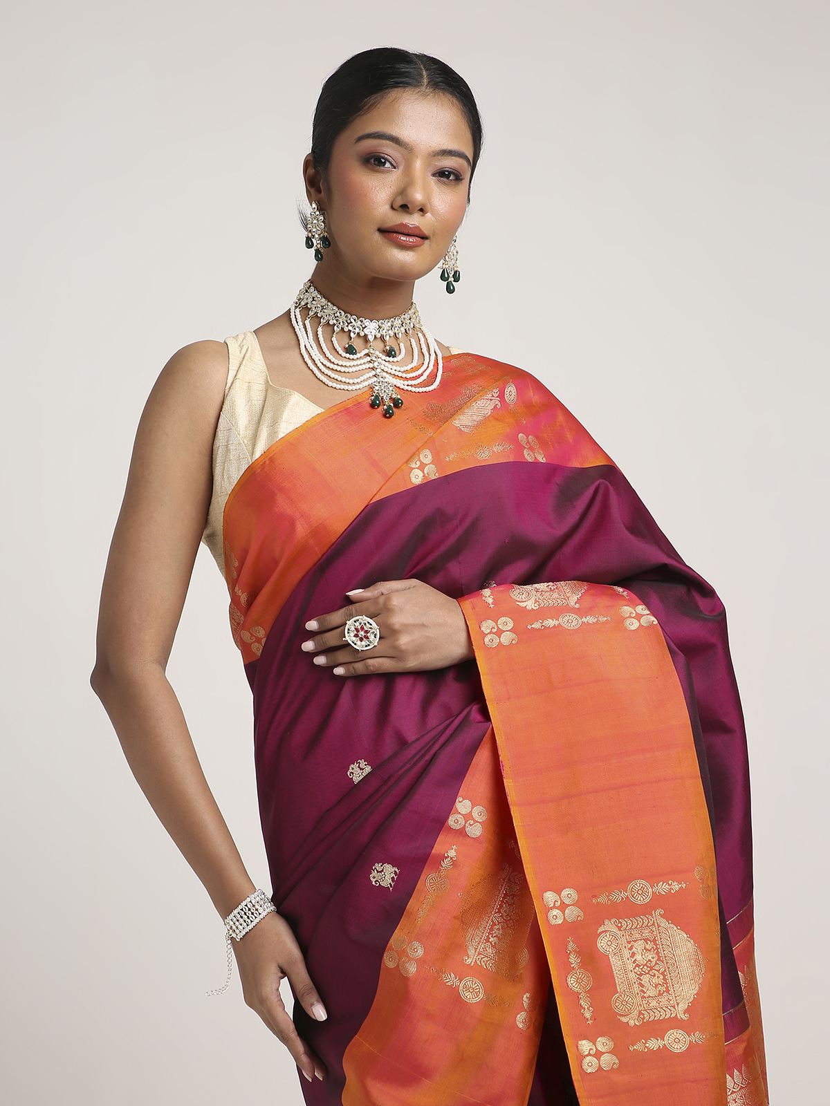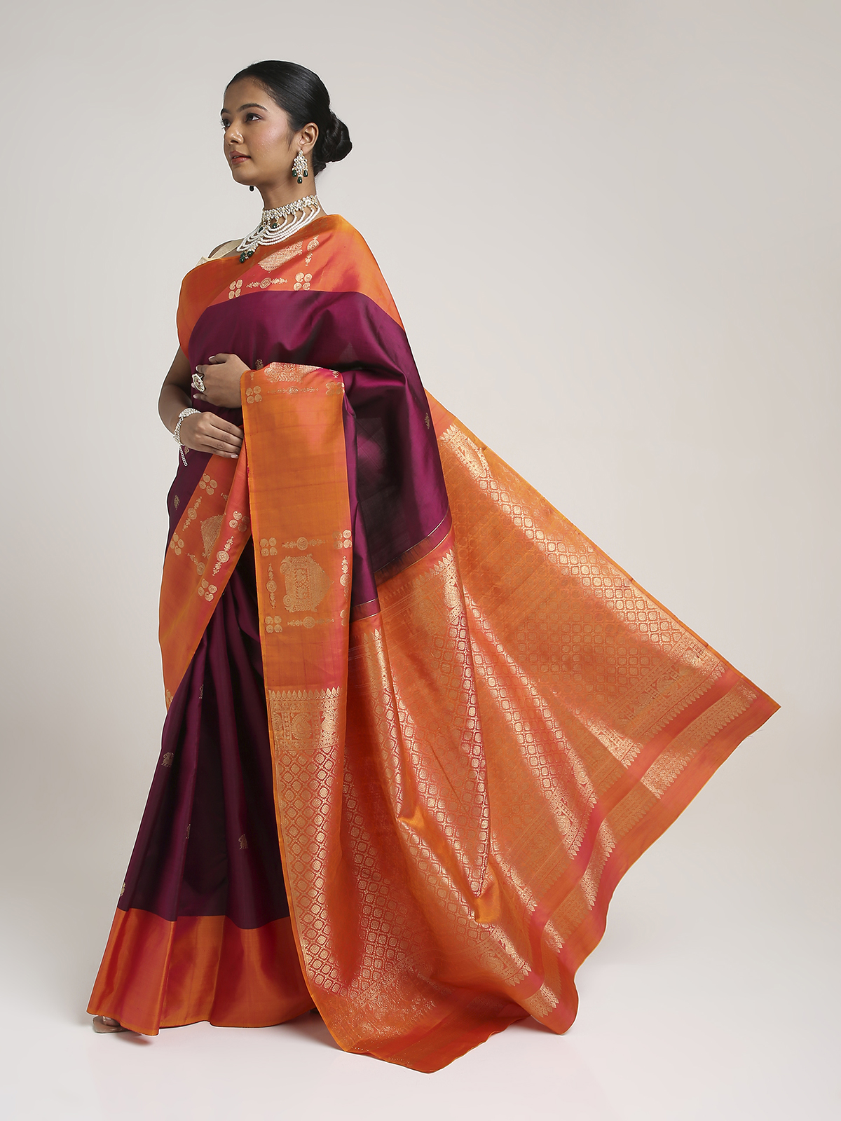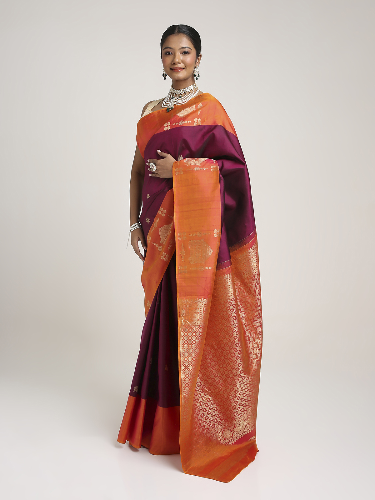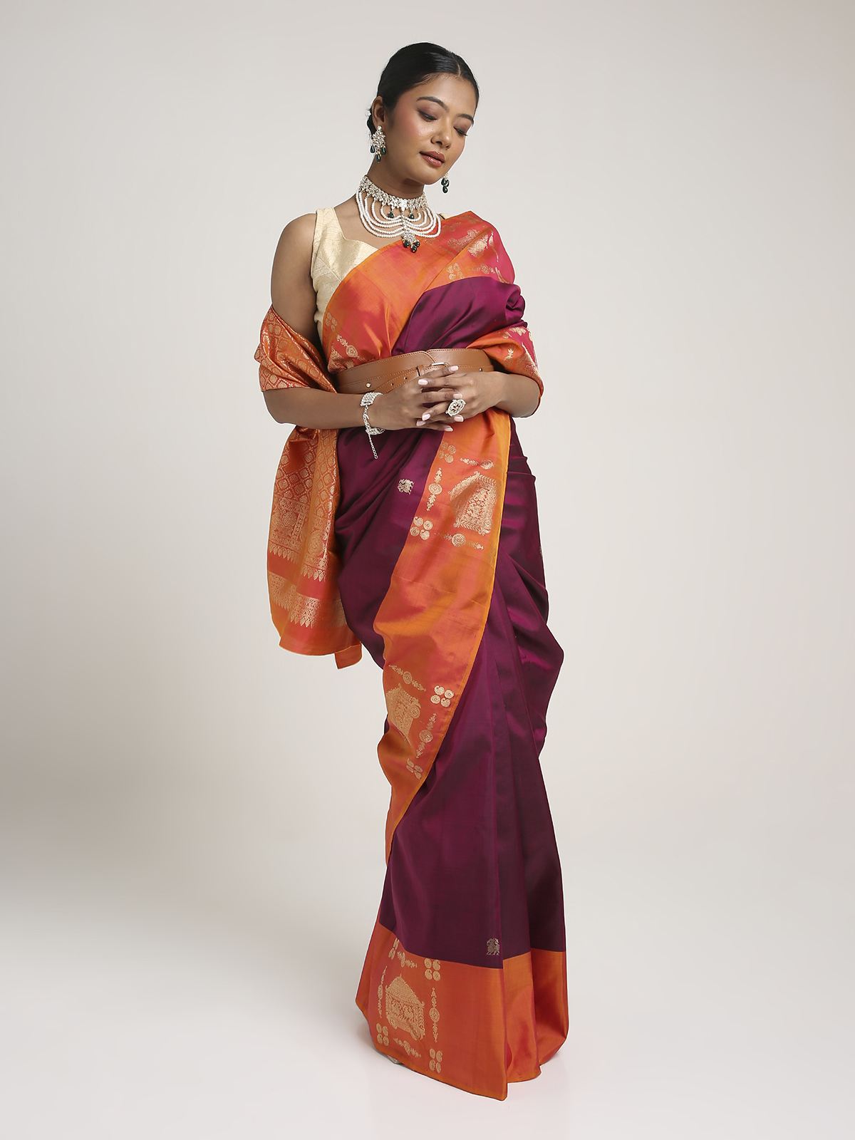 A refined addition to any ethnic wardrobe, this Kanjivaram saree balances festive richness with wearable elegance. Its structured drape and traditional character make it suitable for everything from intimate ceremonies to grand occasions. It is the kind of saree that instantly elevates your presence, offering a polished and graceful look without excess. For women who appreciate timeless weaves and classic beauty, this piece brings enduring appeal and easy sophistication.