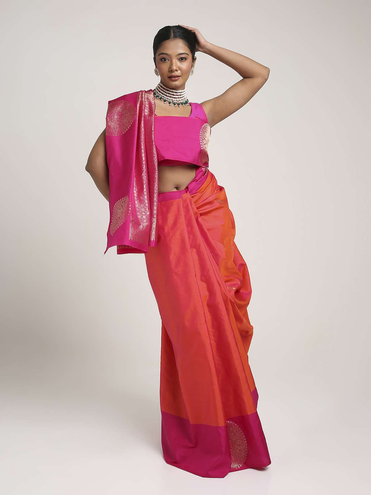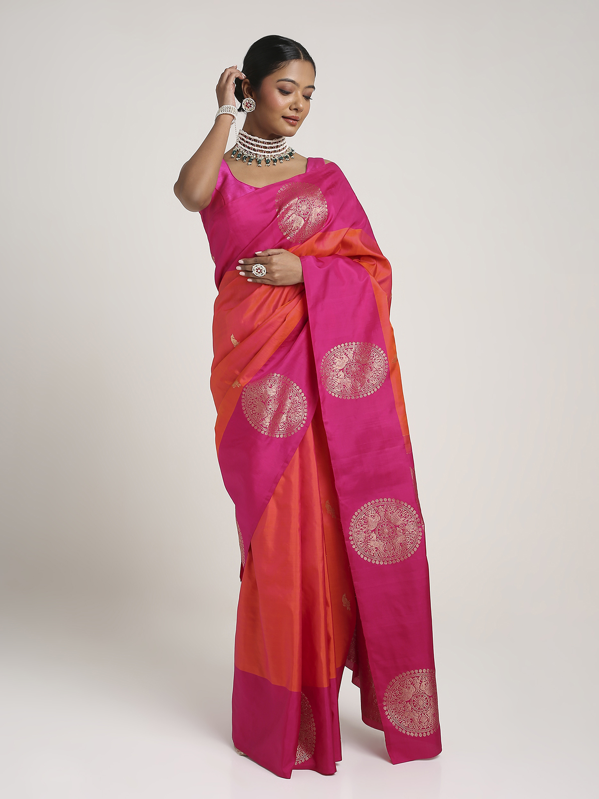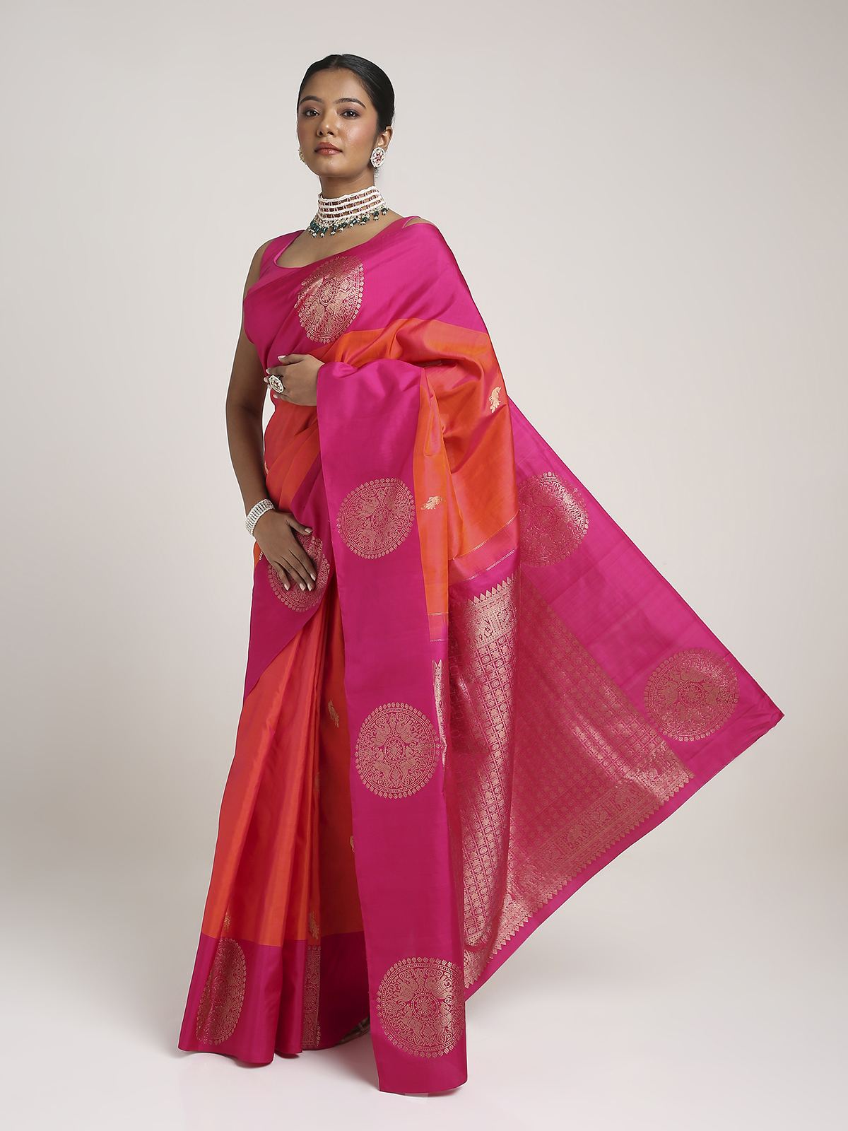 Elegant and rooted in timeless tradition, this Kanjvaram saree is made for women who love classic ethnic silhouettes with a luxurious finish. It carries the richness associated with iconic South Indian weaves while remaining versatile enough for multiple occasions. Whether worn for festive lunches, wedding functions, or traditional celebrations, it offers a poised and graceful statement. A beautiful choice for building a curated saree collection with heritage-inspired essentials.